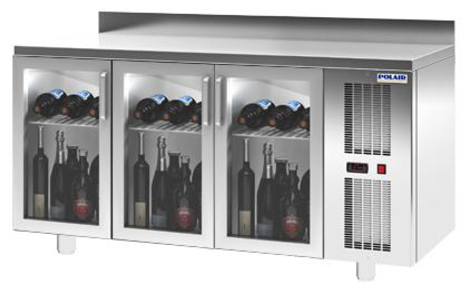 Холодильный стол Polair TD3GN-GC— 3-секционная модель с боковым расположением агрегата и столешницей, которую можно использовать как рабочую поверхность для повара или специалиста по приготовлению коктейлей. Прозрачные стеклопакеты дверок и внутренняя светодиодная подсветка обеспечивают отличный обзор продукции для покупателей и посетителей заведения. Дополнительная опция — мобильное исполнение с комплектом поворотных колес.