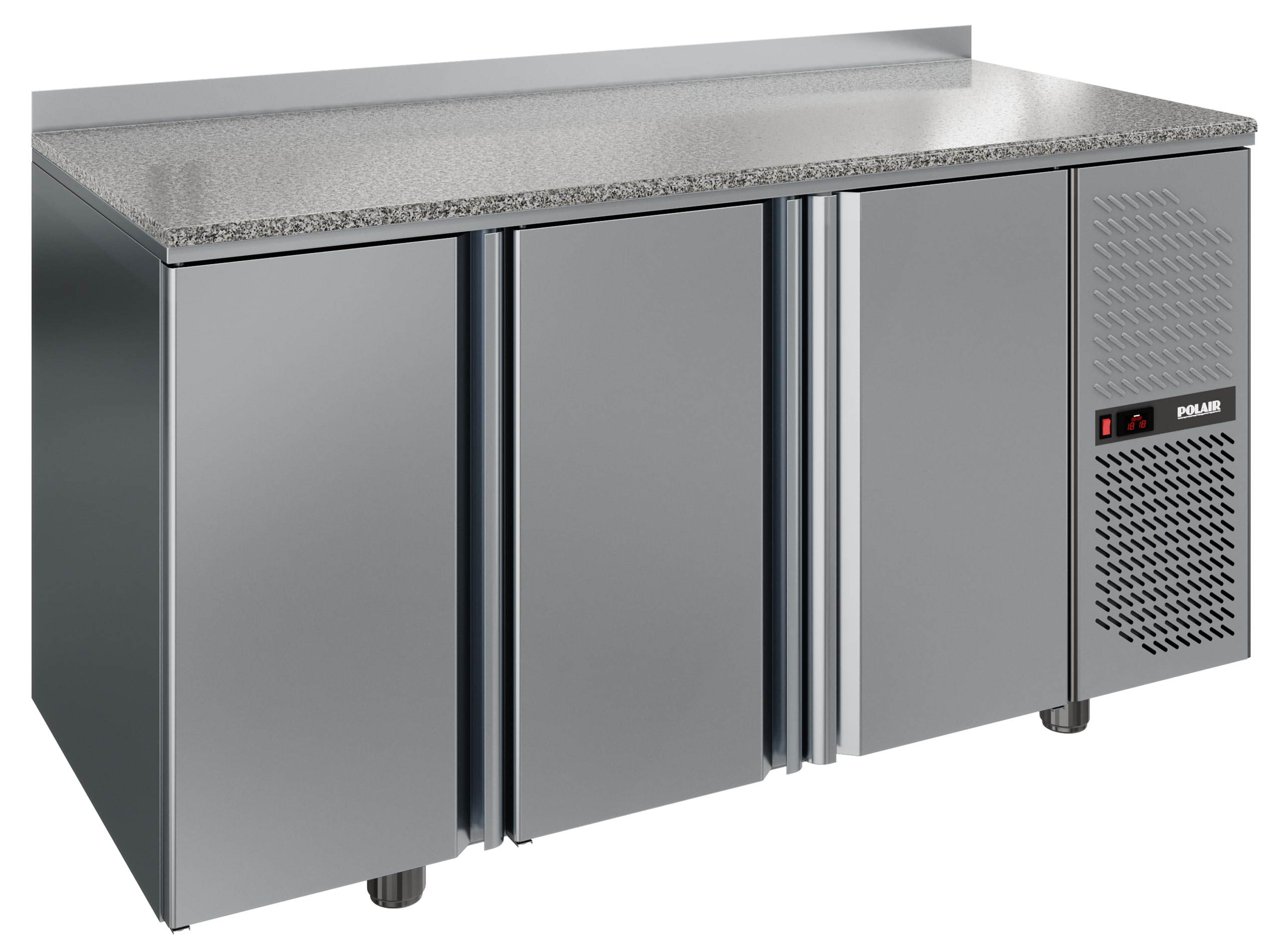 Холодильный стол Polair ТМ3-G (гранит)— одна из 3-секционных моделей серии Grande с боковым расположением агрегата и обшивками корпуса из нержавеющей стали. Стенки корпуса достаточно толстые и содержат пенополиуретановое наполнение, что обеспечивает надежную теплоизоляцию охлаждаемого объема. Хладагент R290 (пропан), которым заправляется система охлаждения, позволил снизить показатели энергопотребления в 2 раза в сравнении с предыдущим хладагентом.