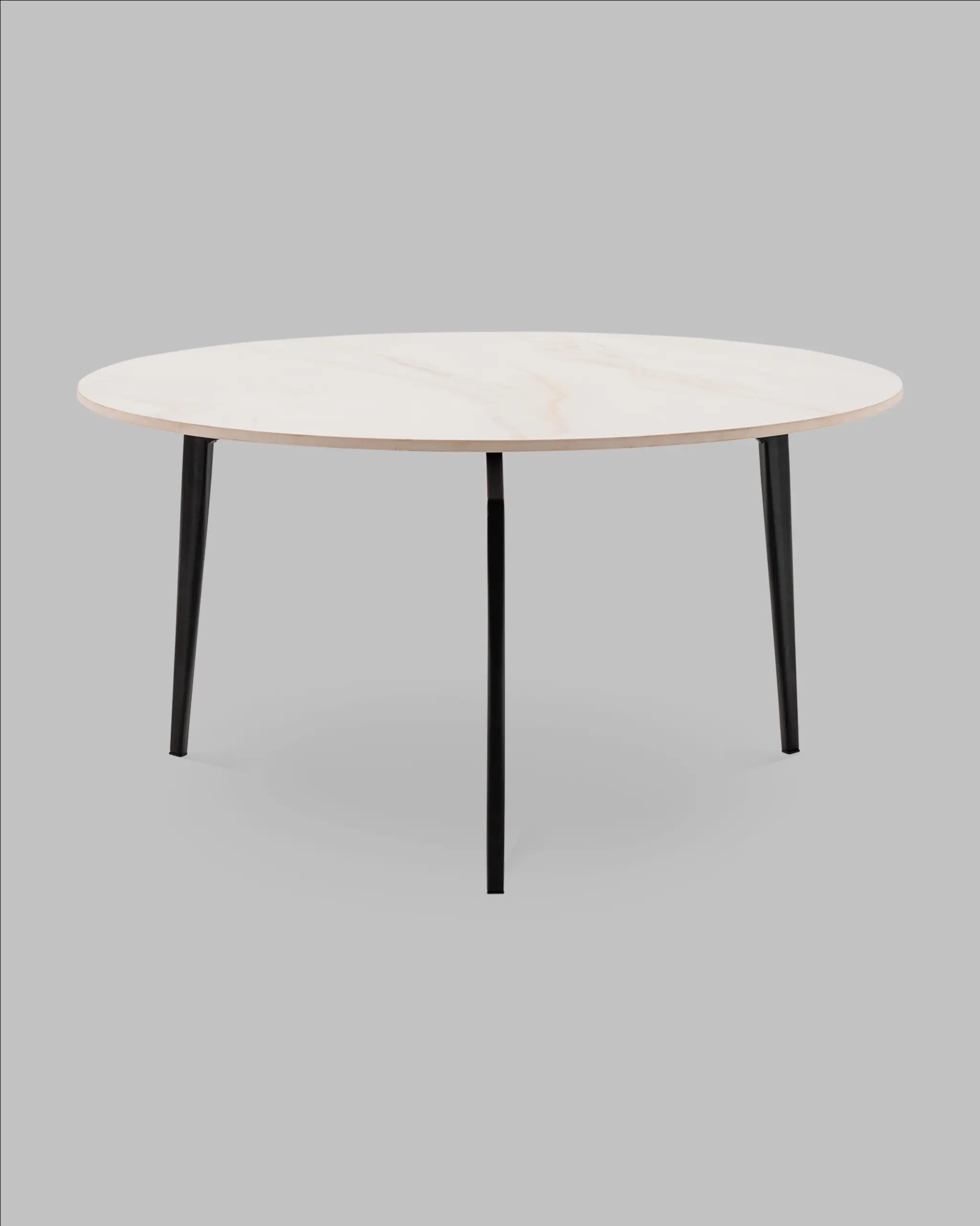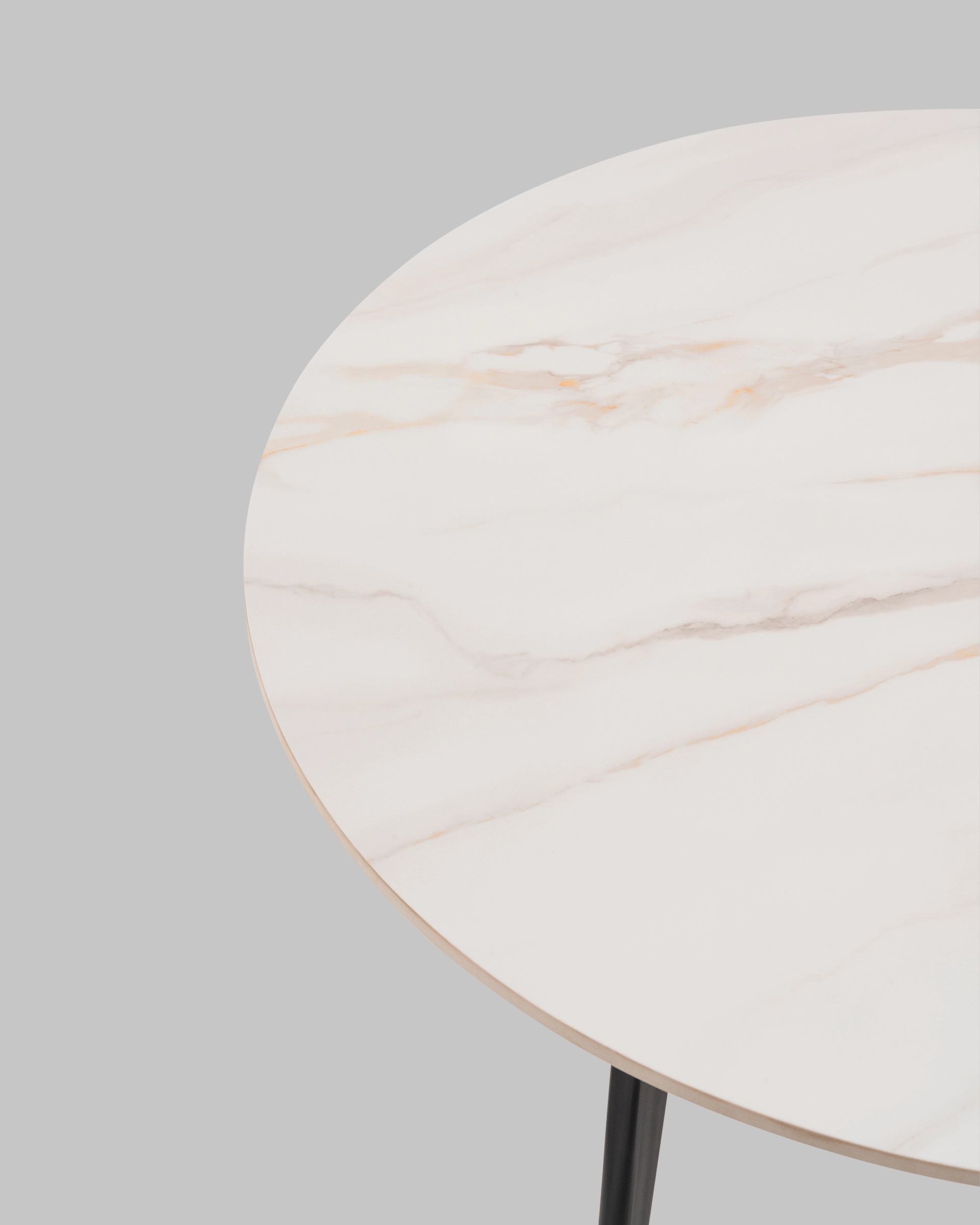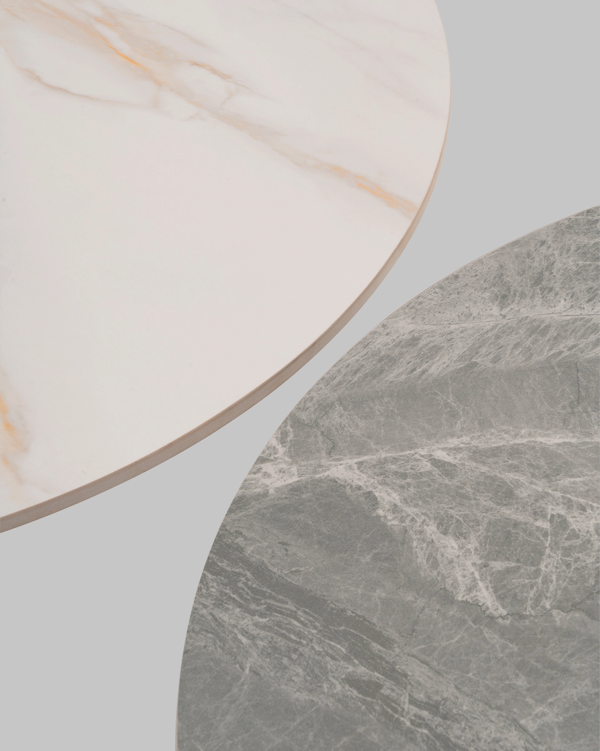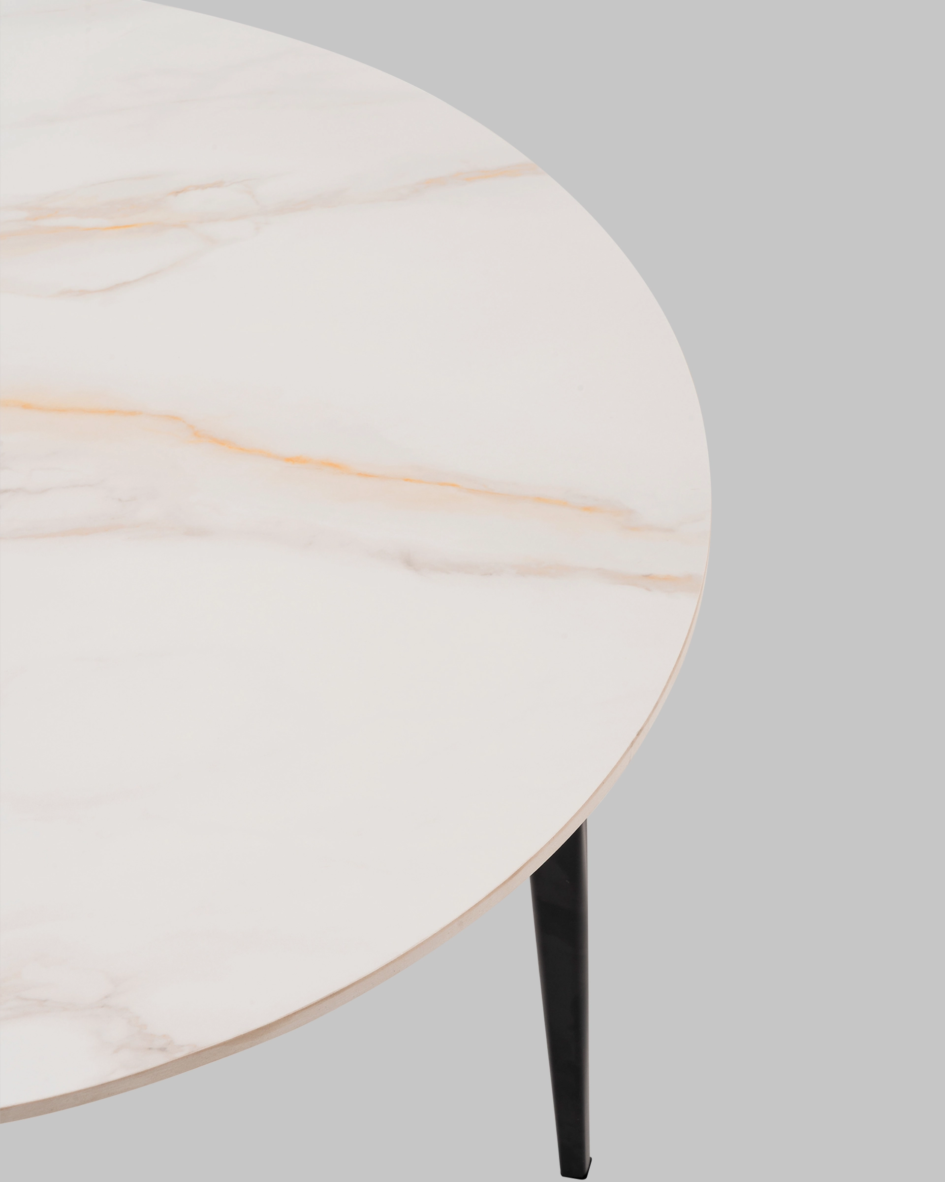 Столешница выполнена из керамикив благородном сером оттенке с имитацией мраморной текстуры. Это не только визуально привлекательное решение, но и практичное: керамика устойчива к царапинам, высокой температуре и легко очищается.Ножки из металлаобеспечивают надёжность и долгий срок службы изделия.