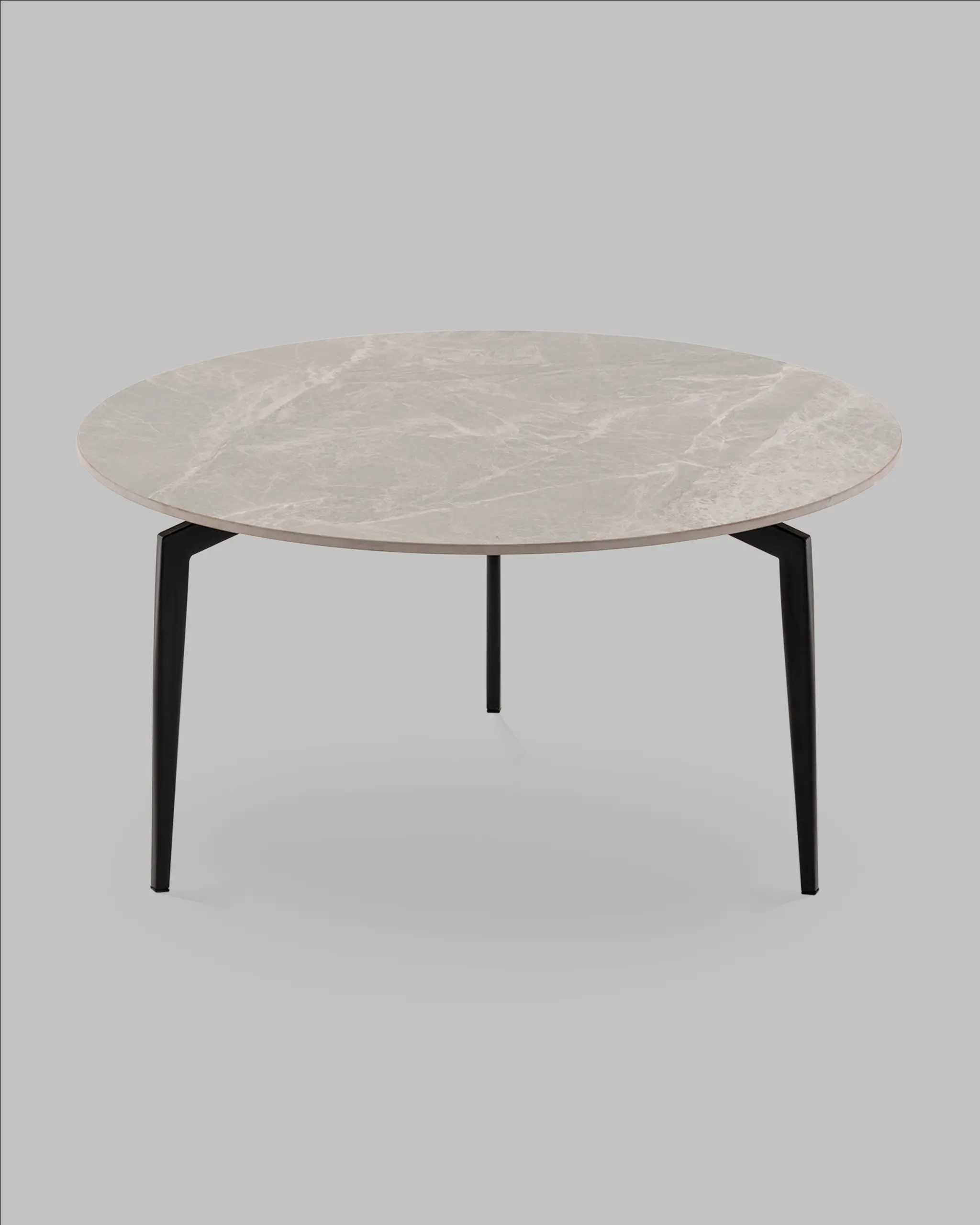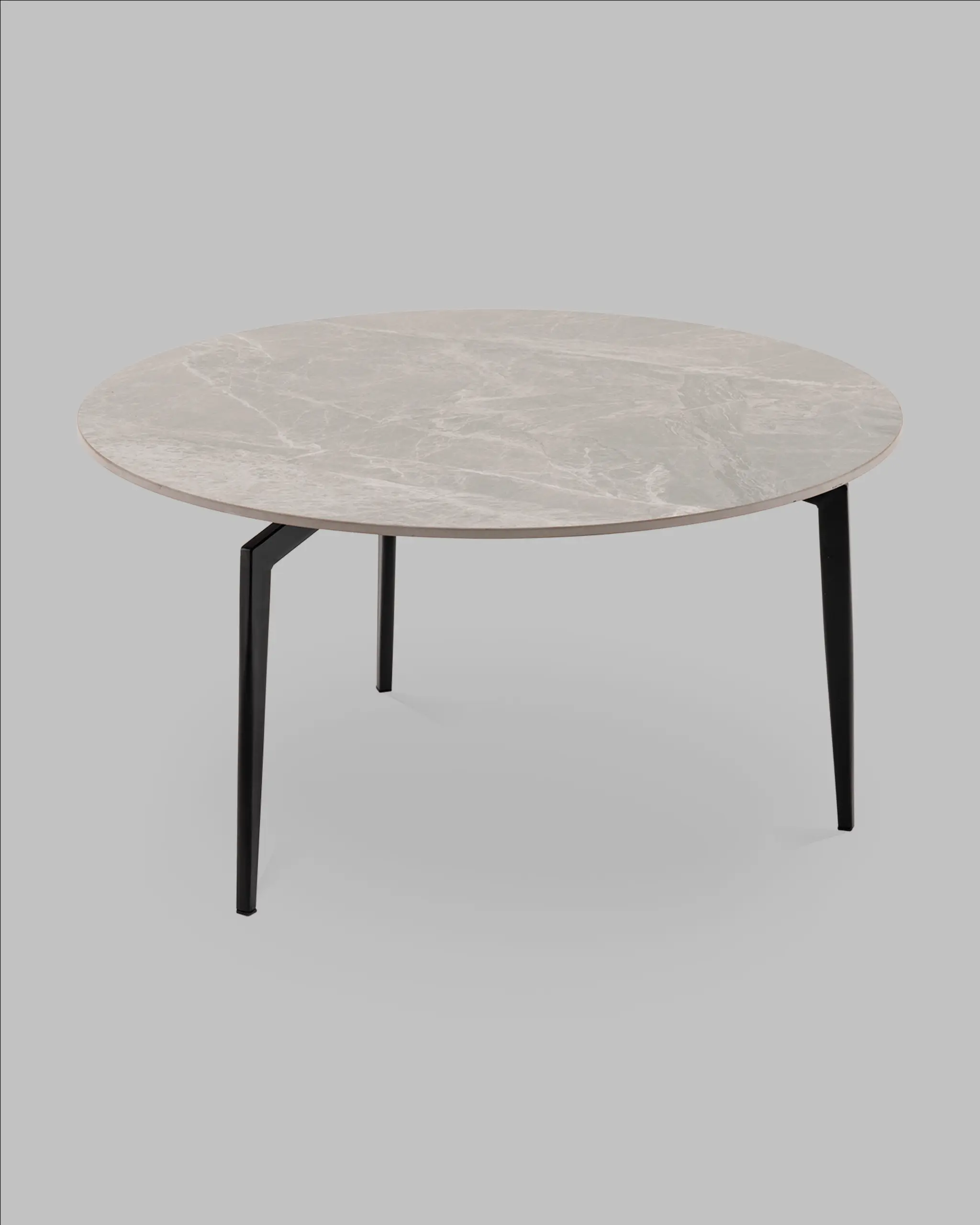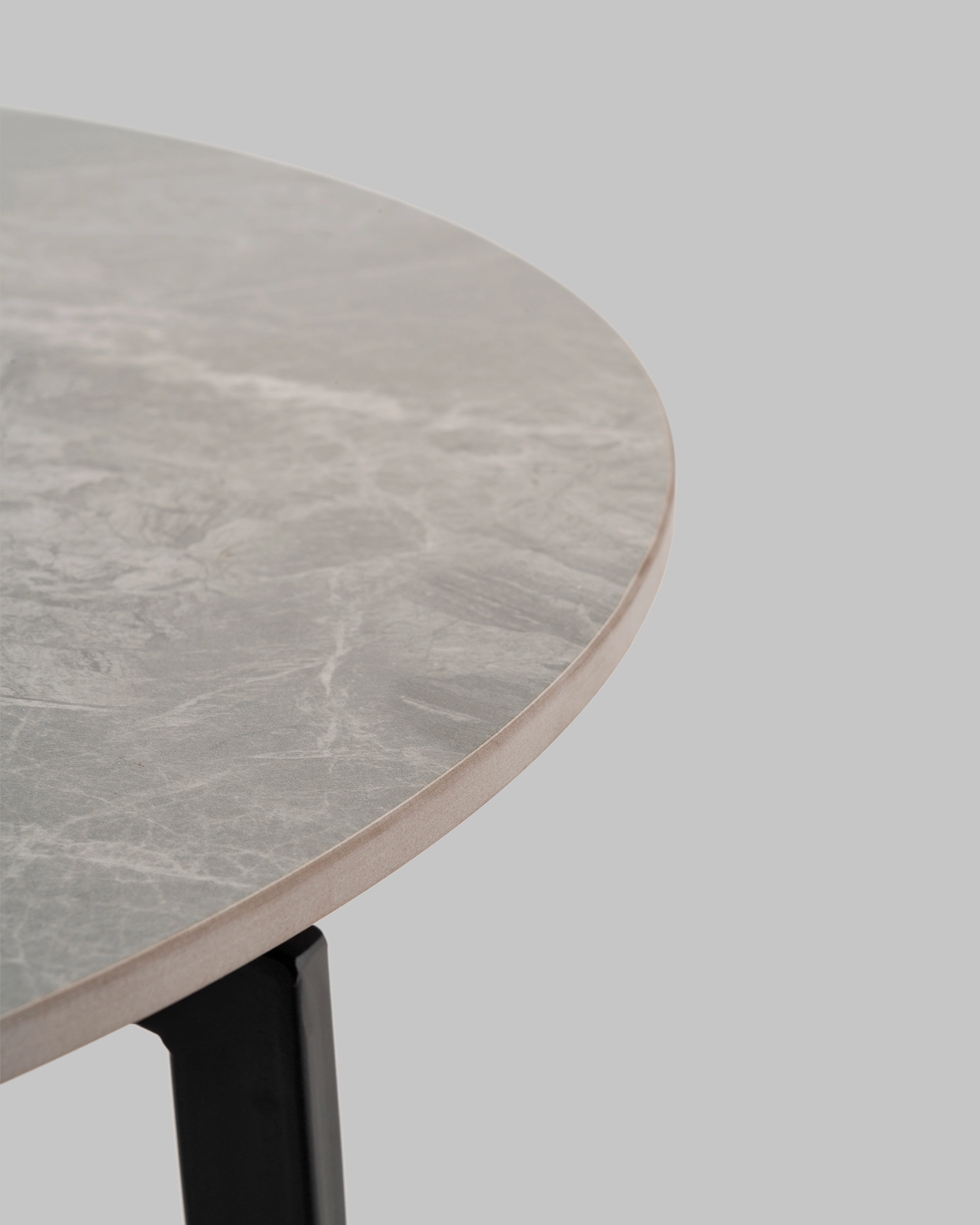 Столешница выполнена из керамикив благородном сером оттенке с имитацией мраморной текстуры. Это не только визуально привлекательное решение, но и практичное: керамика устойчива к царапинам, высокой температуре и легко очищается.Ножки из металлаобеспечивают надёжность и долгий срок службы изделия.