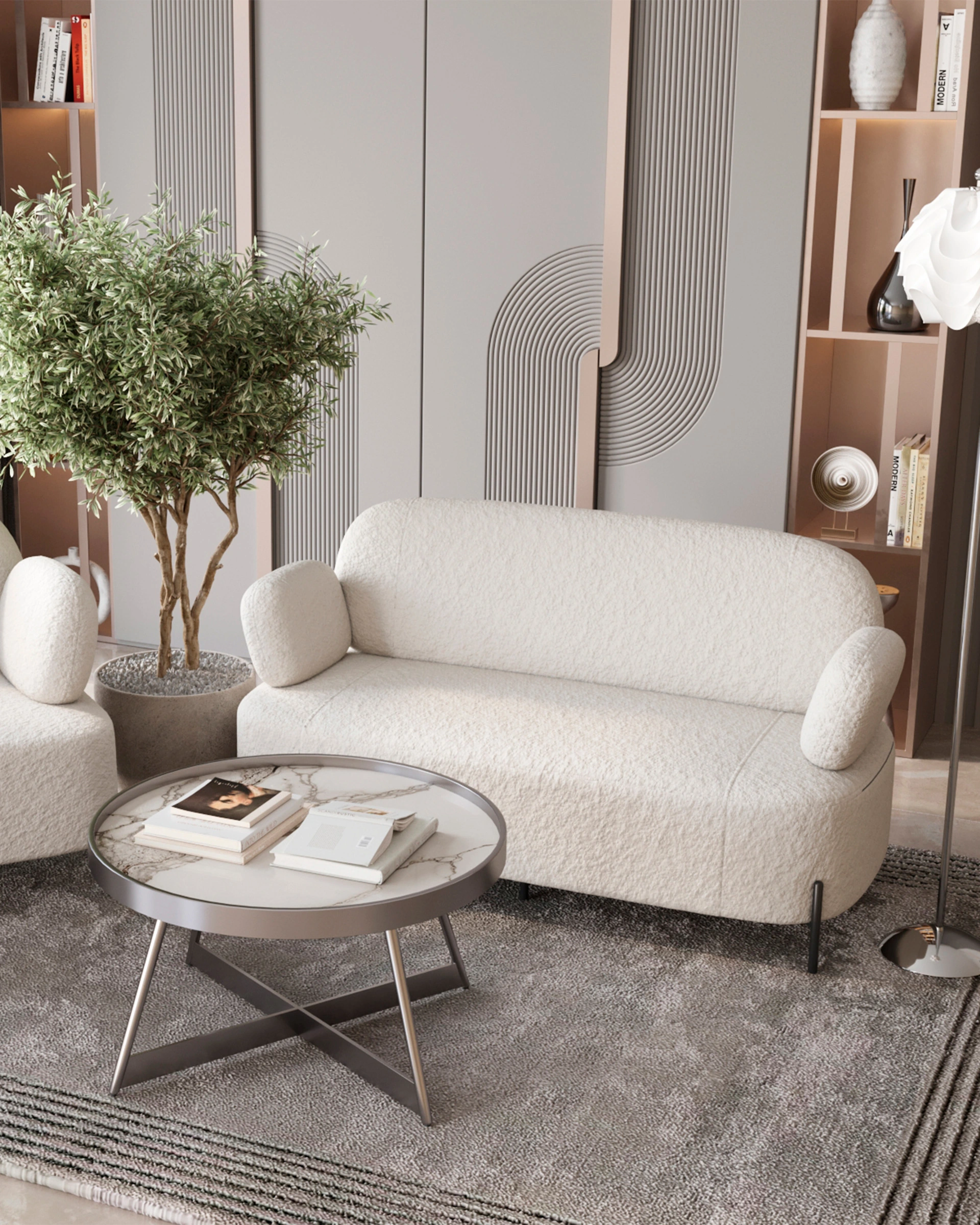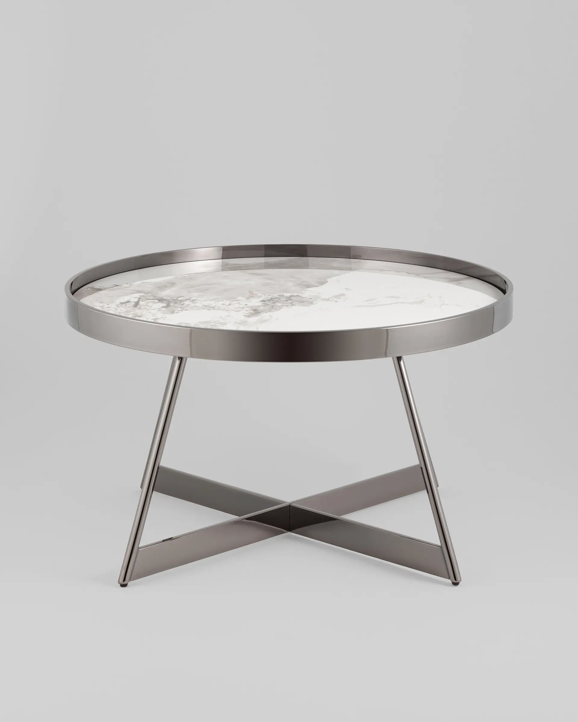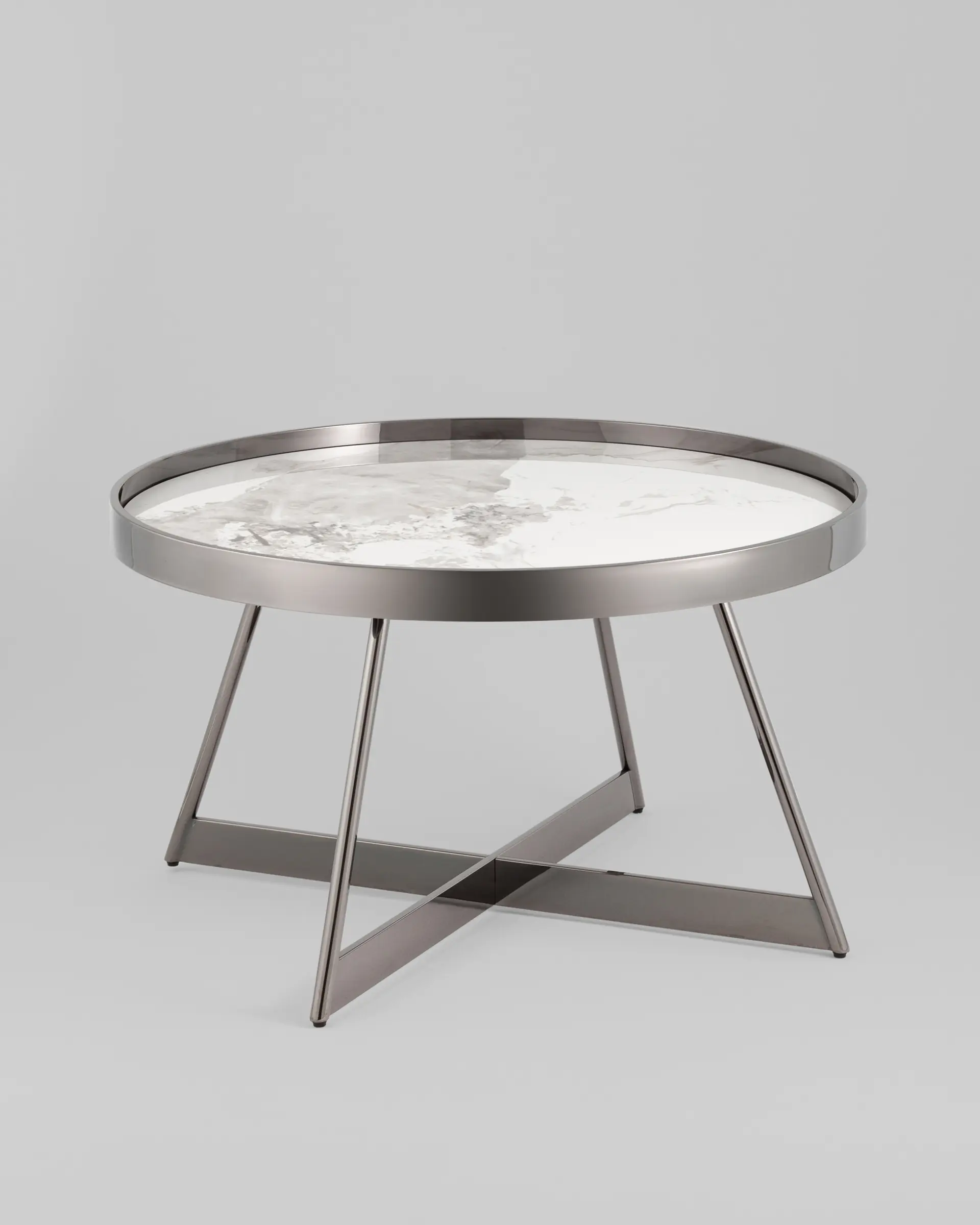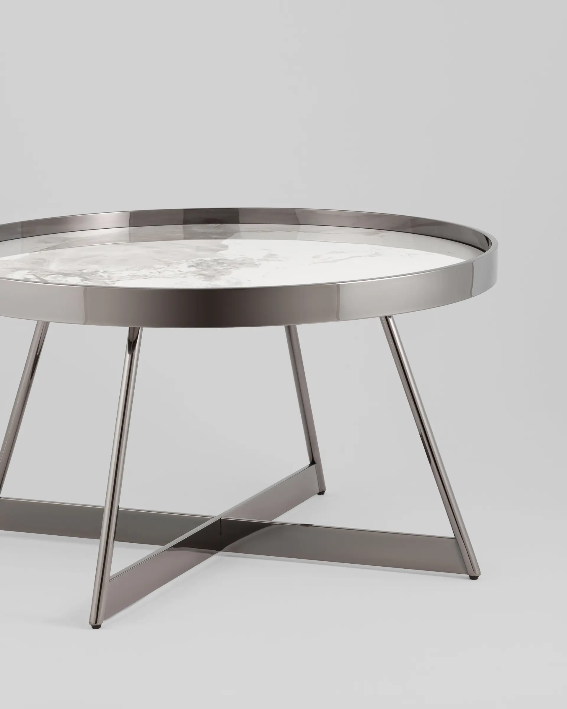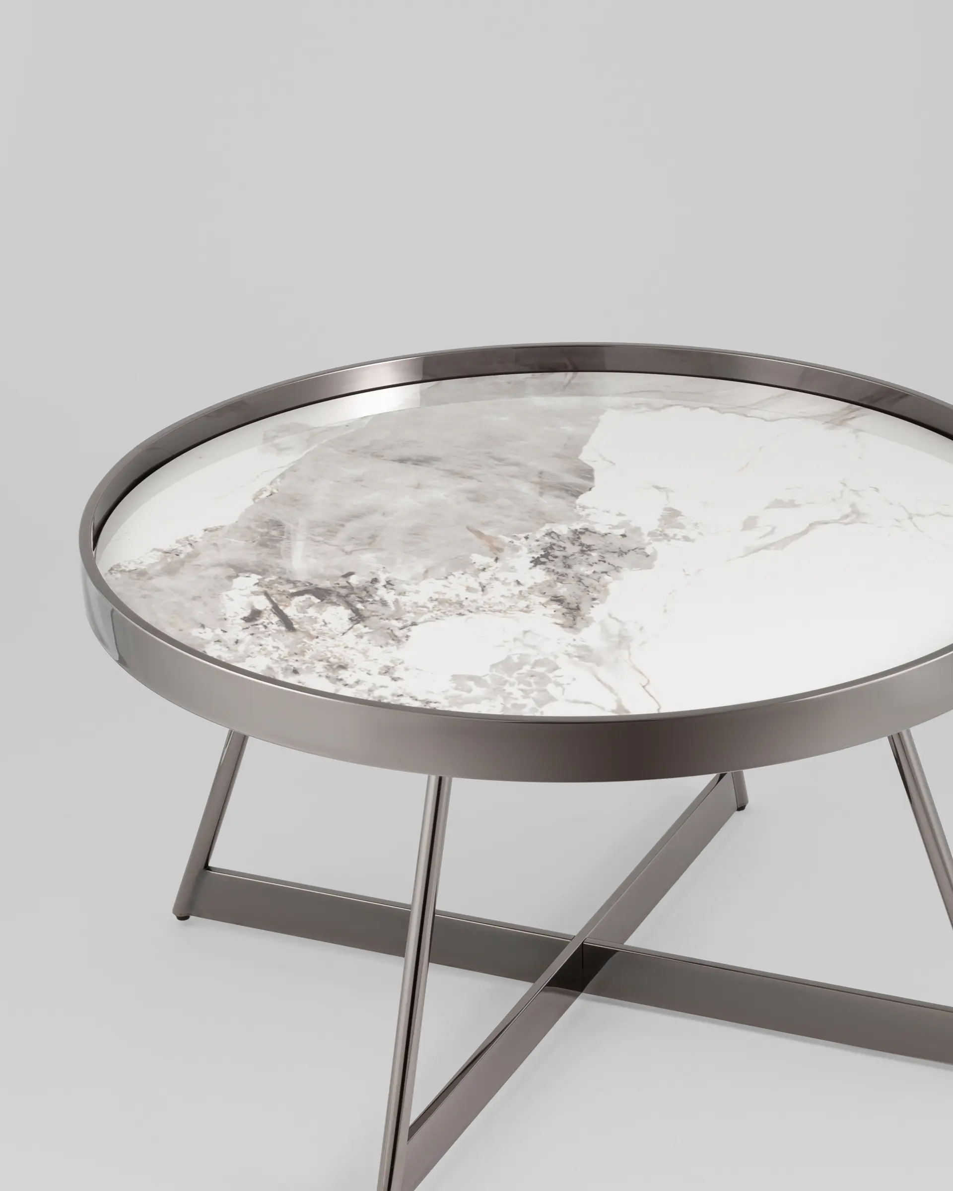 Прочная конструкция столика полностью изготовлена из стали в цвете темный хром. Круглая столешница из керамики мраморного рисунка мгновенно приковывает взгляд и завораживает, создавая яркий акцент.
