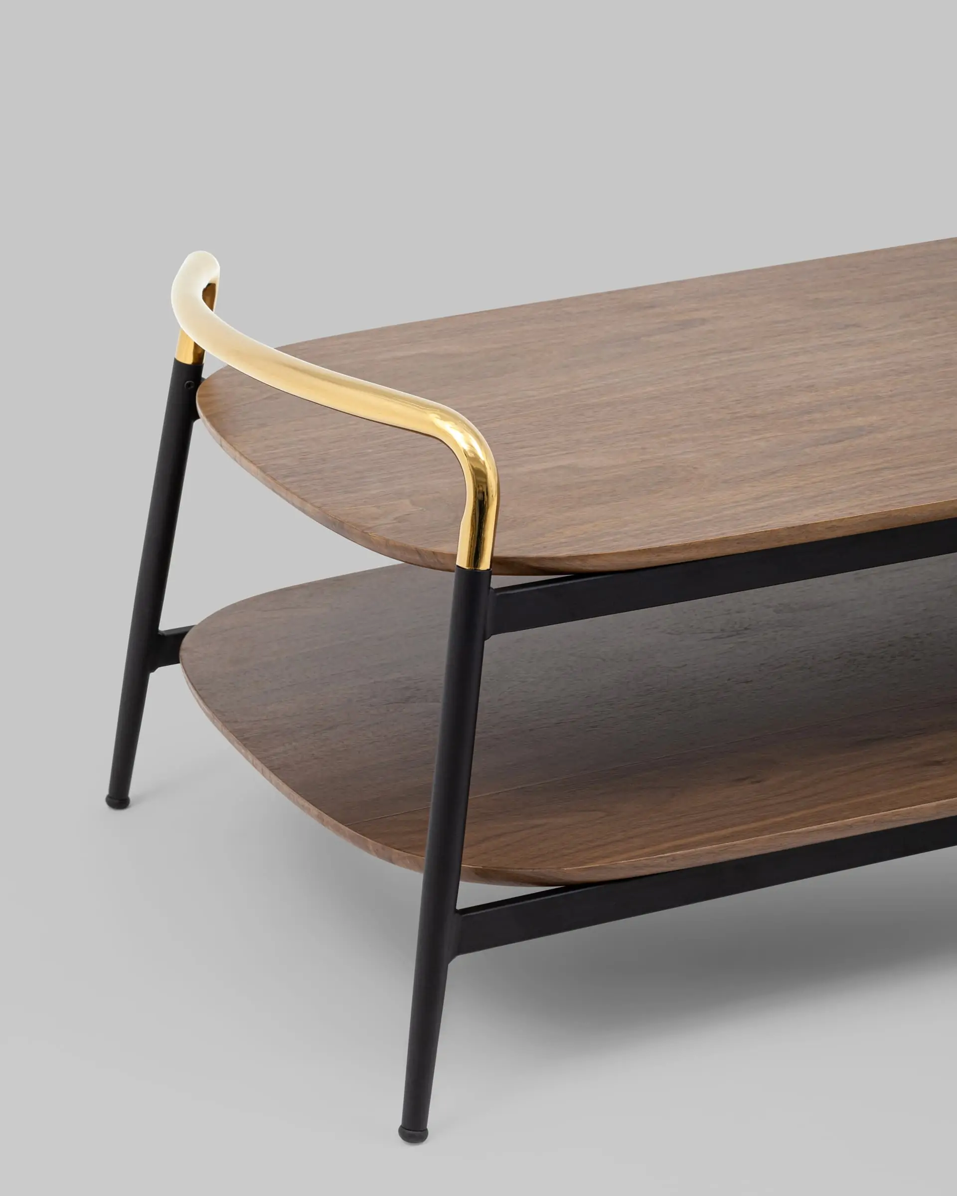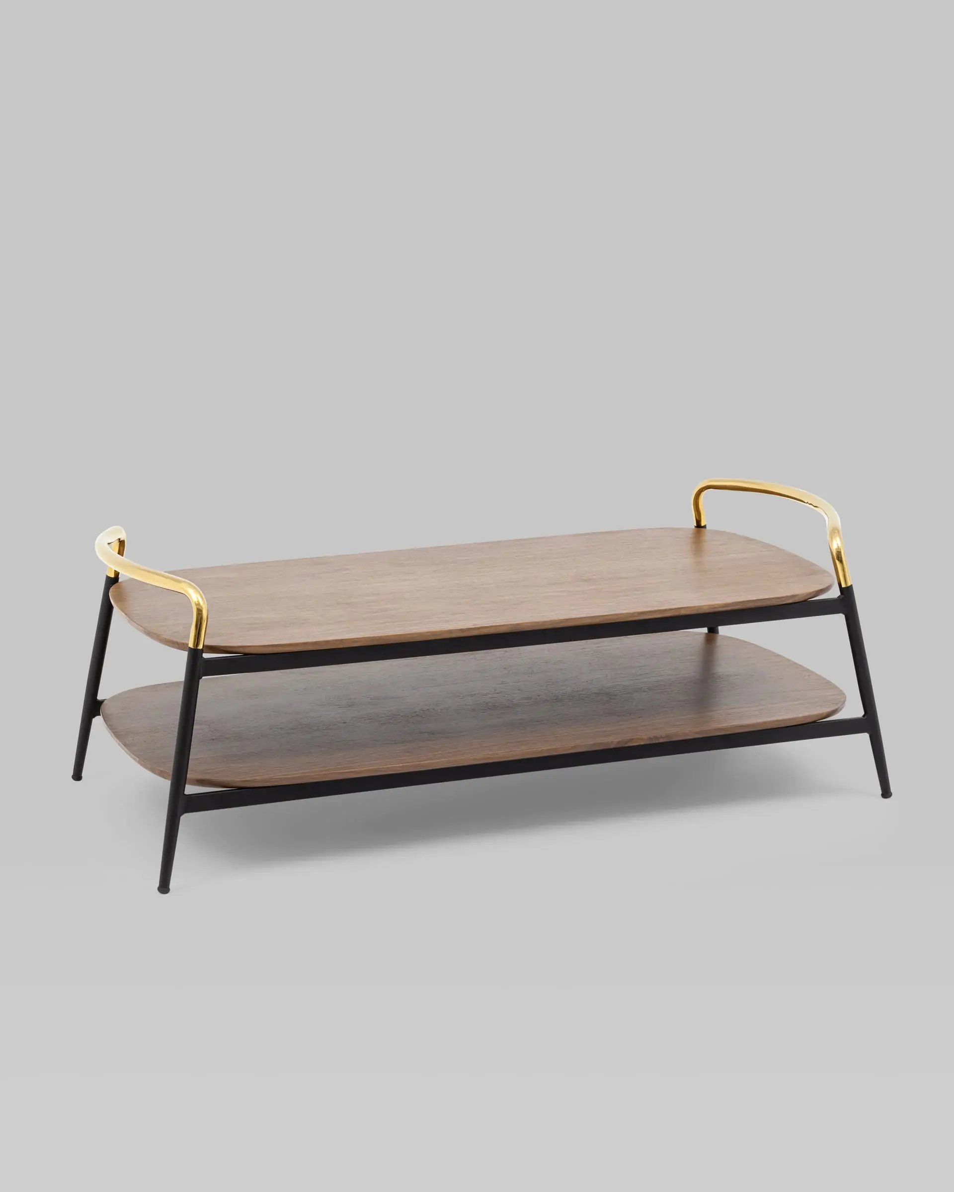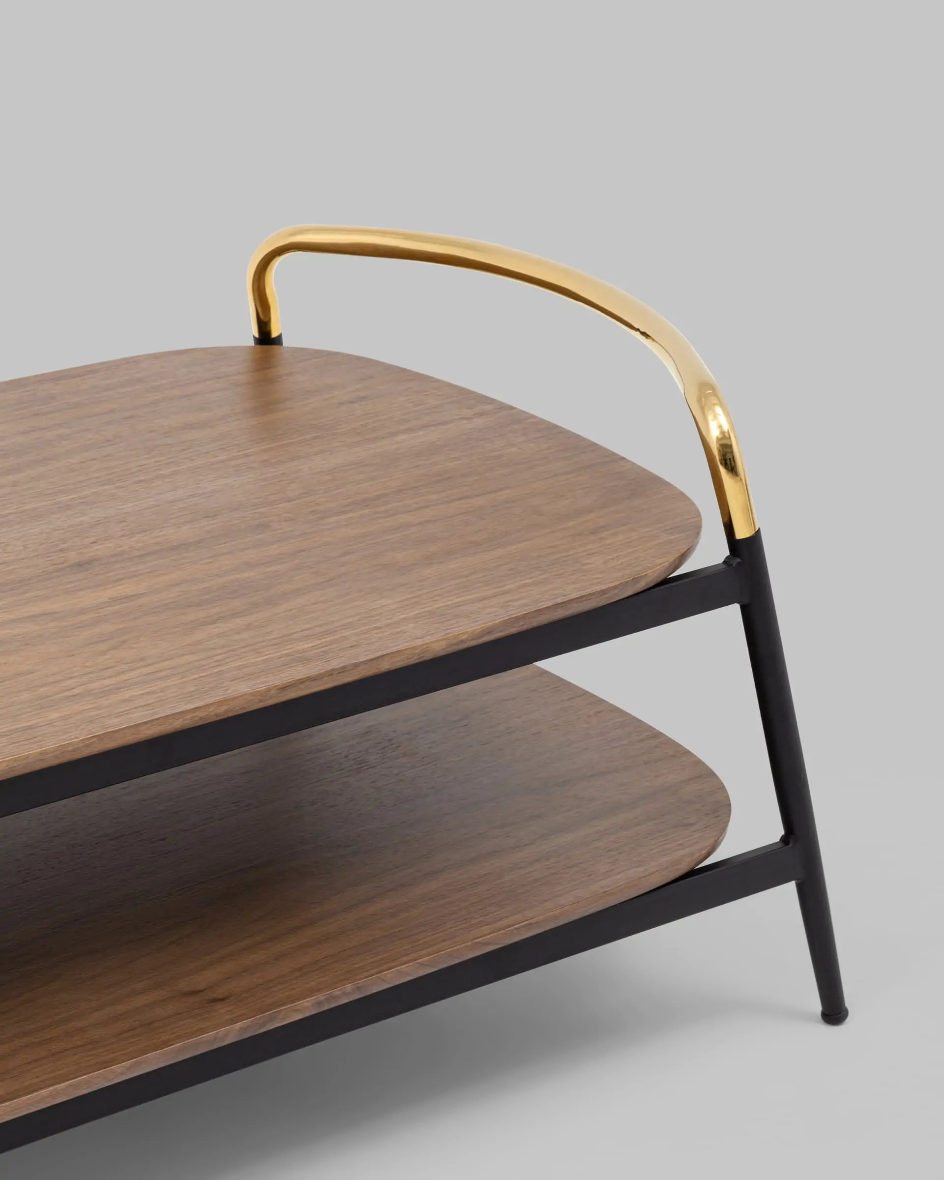 Стильный журнальный стол Нолан прекрасно дополнит интерьер гостиной. Прямоугольная столешница с закругленными углами выполнена из МДФ и покрыта шпоном в оттенке темного дерева. Под столешницей предусмотрена полка для хранения различных мелочей или журналов. Металлический каркас в черном цвете и золотые ручки гармонично сочетаются со столешницей. В основании ножек предусмотрены специальные подпятники, которые предотвращают скольжение и повреждение напольного покрытия.