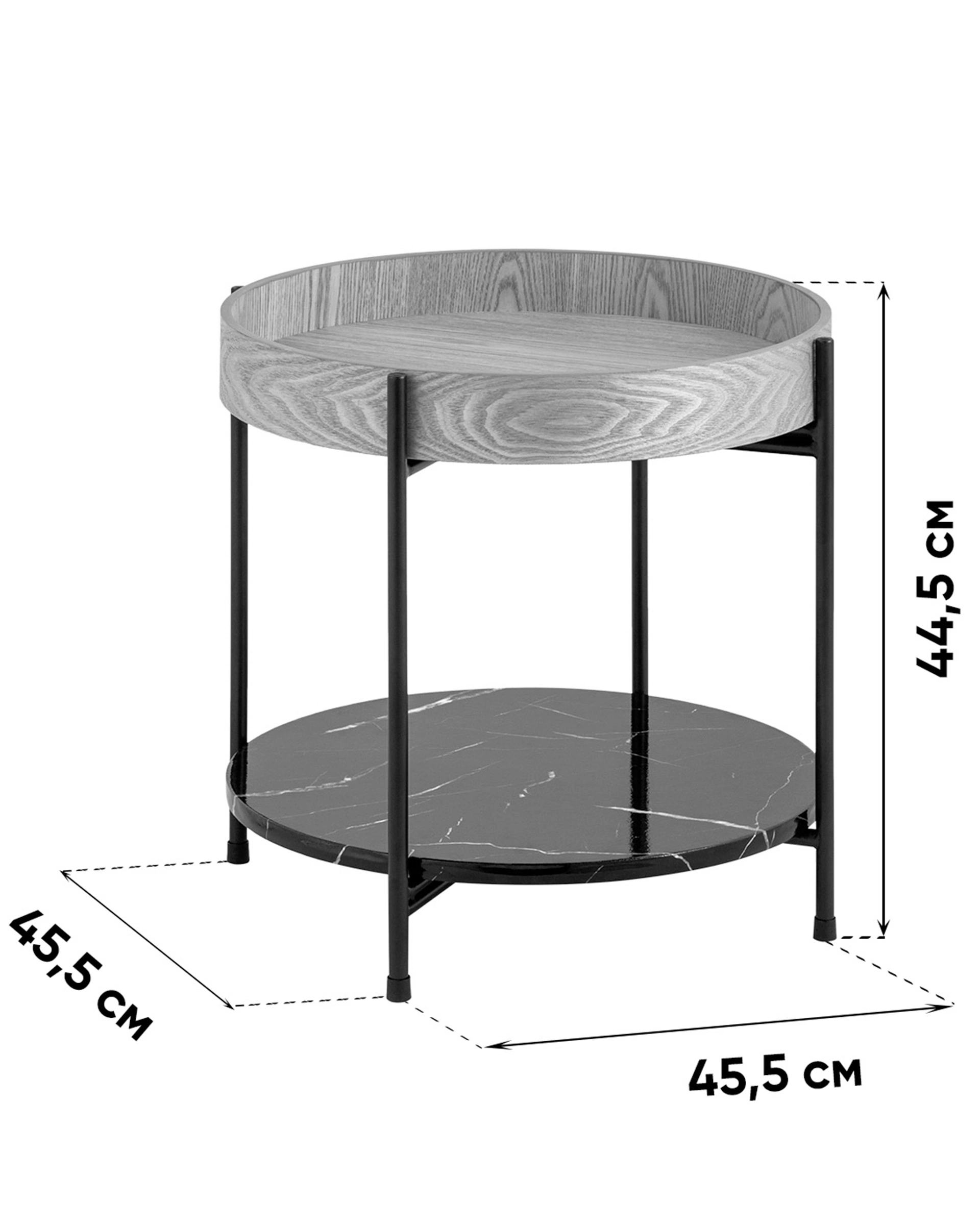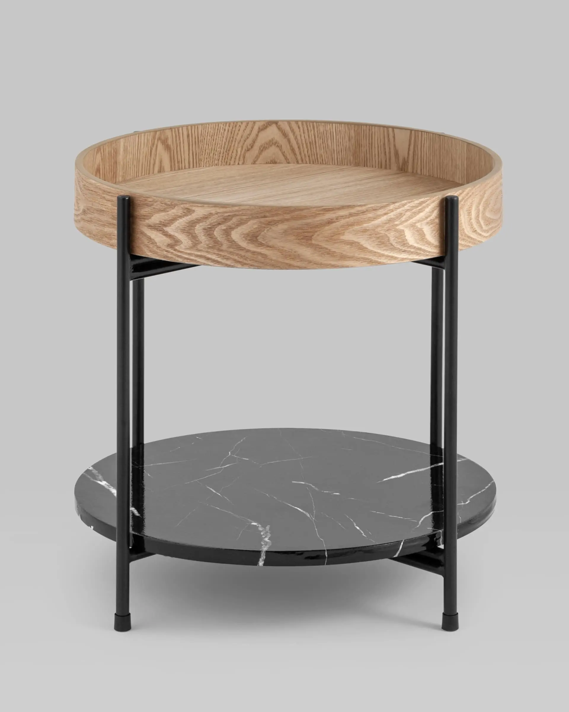 Круглый журнальный столик в современном минималистичном дизайне впишется в любой интерьер. Столешница выполнена из МДФ и покрыта шпоном из ясеня. Высокие бортики по краям предотвращают падение предметов со столика. Нижняя полка из МДФ с рисунком под мрамор идеально подойдет для хранения книг или журналов. Черный металлический каркас выдерживает нагрузку до 50 кг. Пластиковые подпятники в основании ножек защищают напольные покрытия от царапин и предотвращают скольжение.