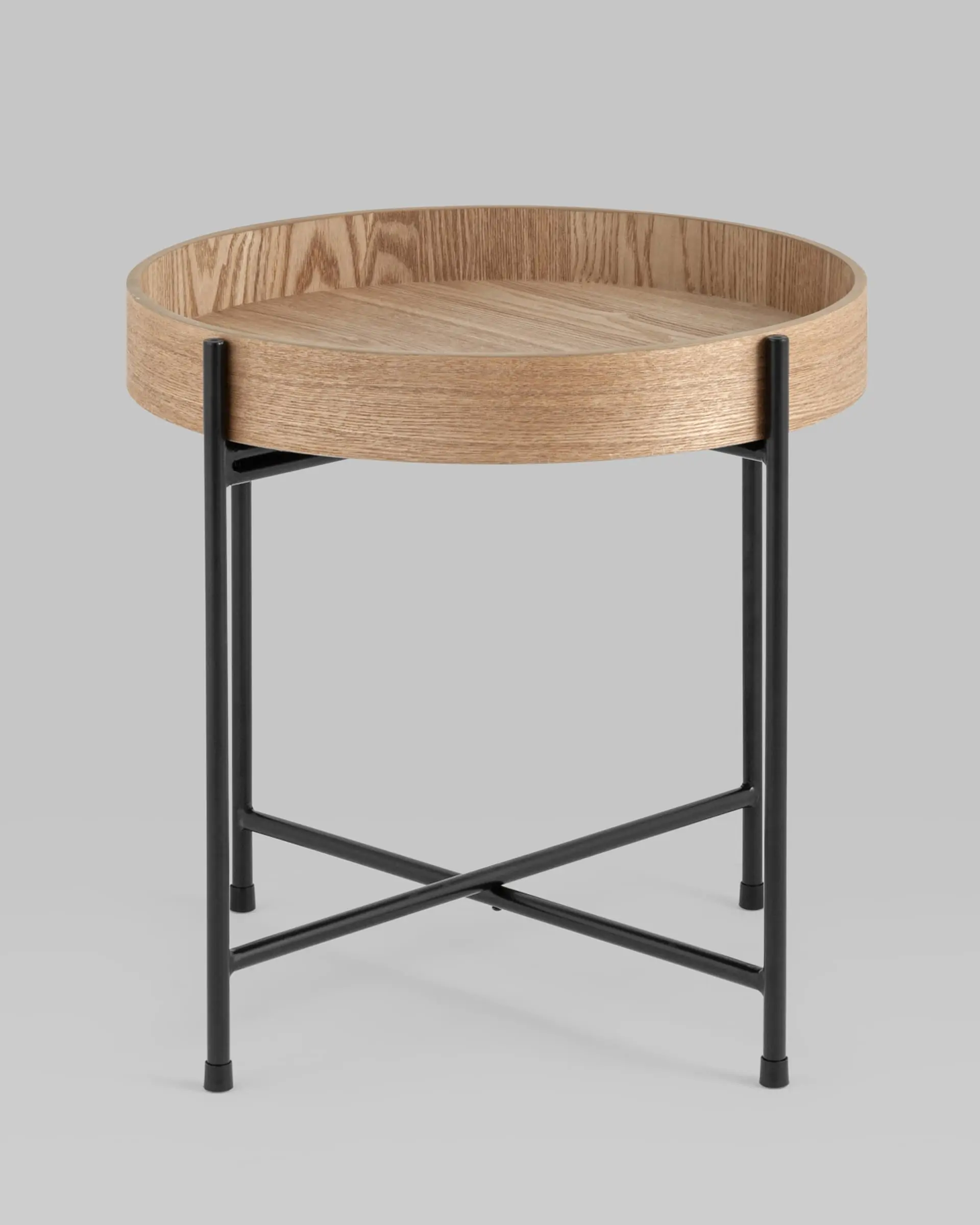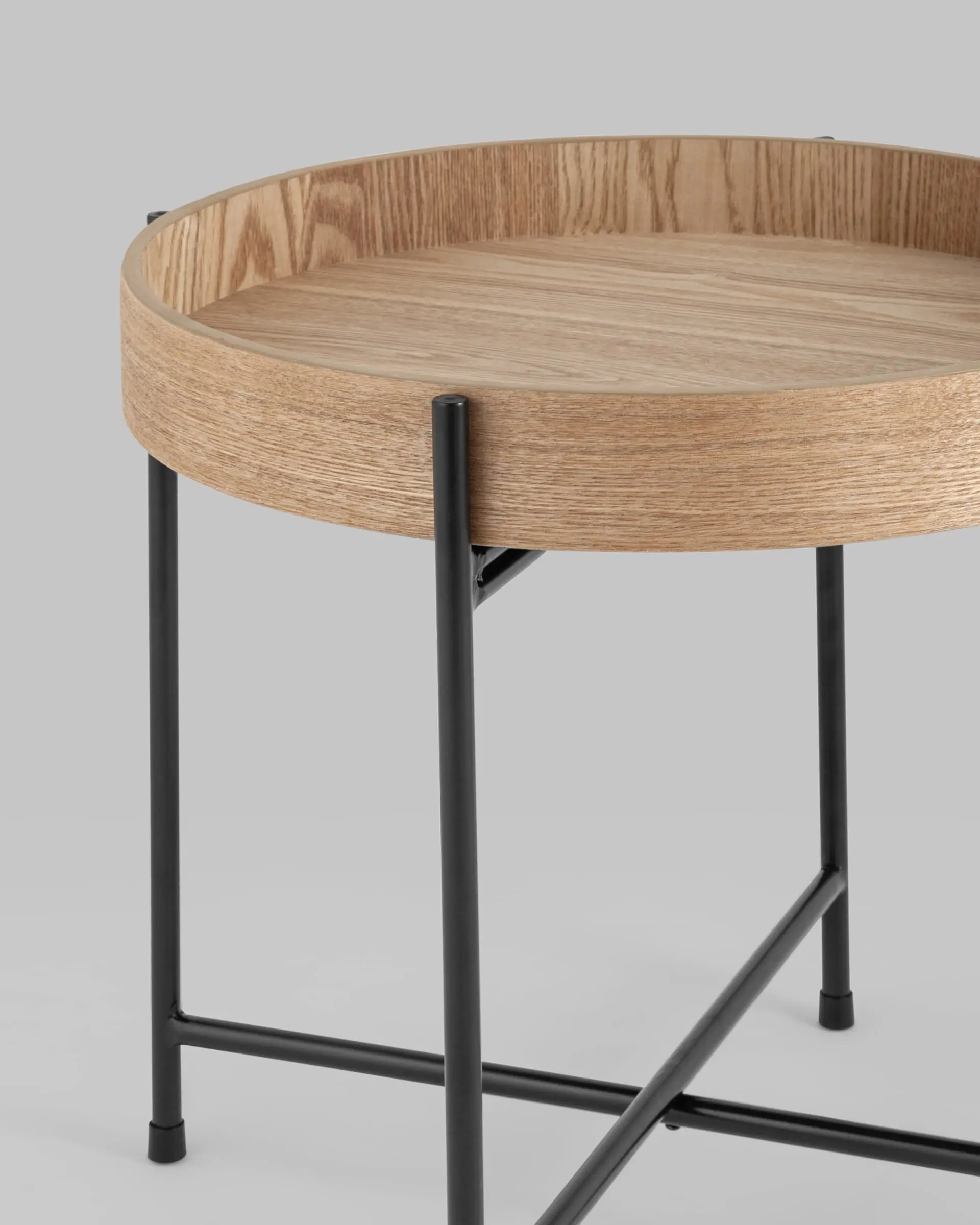 Лаконичный журнальный столик Стар. Круглая столешница выполнена из МДФ и покрыта шпоном из ясеня. Высокие бортики по краям предотвращают падение предметов со столика и добавляют удобства при использовании. Металлический каркас в черном цвете выдерживает нагрузку до 50 кг. Столик станет практичным дополнением интерьера спальни или прихожей.