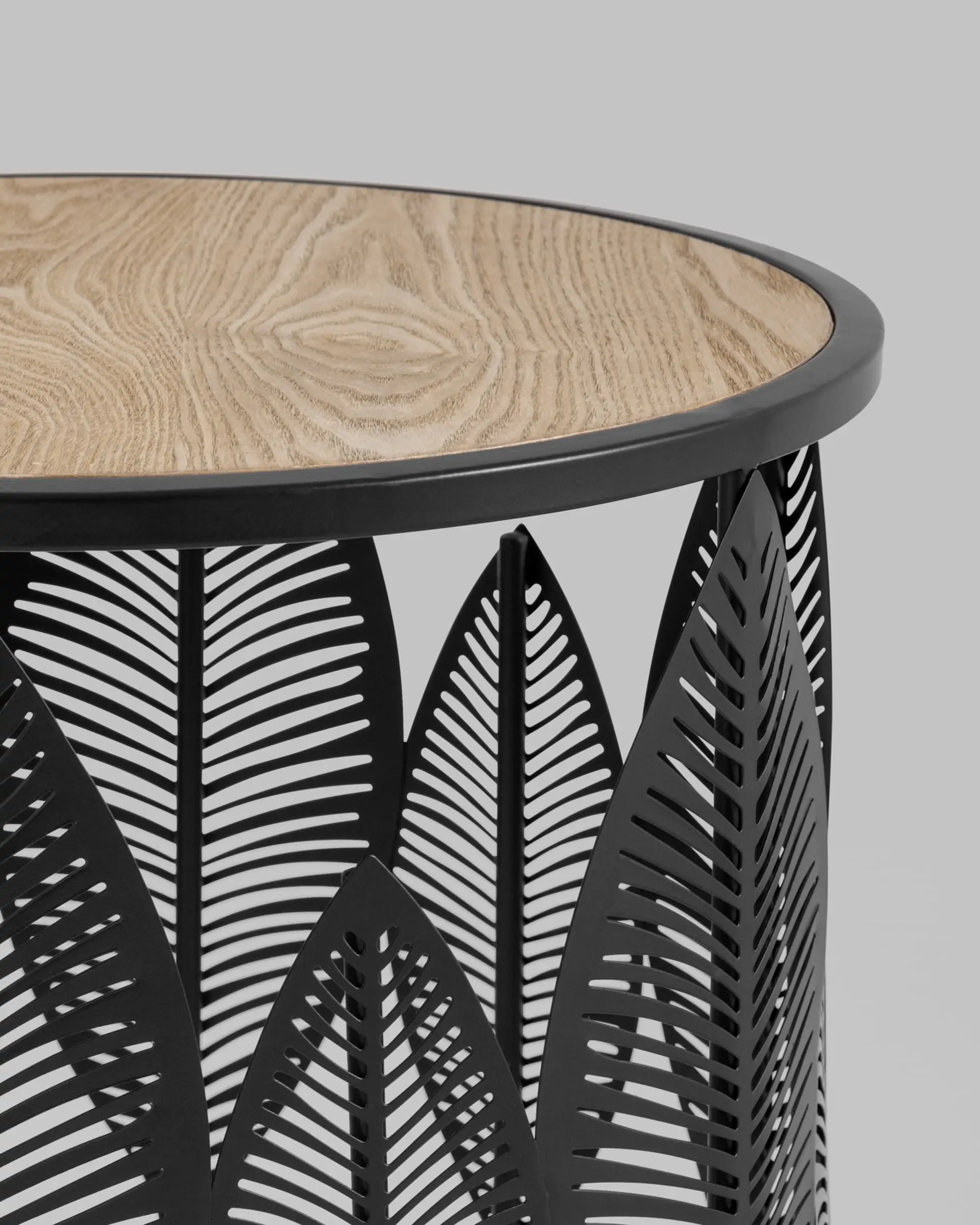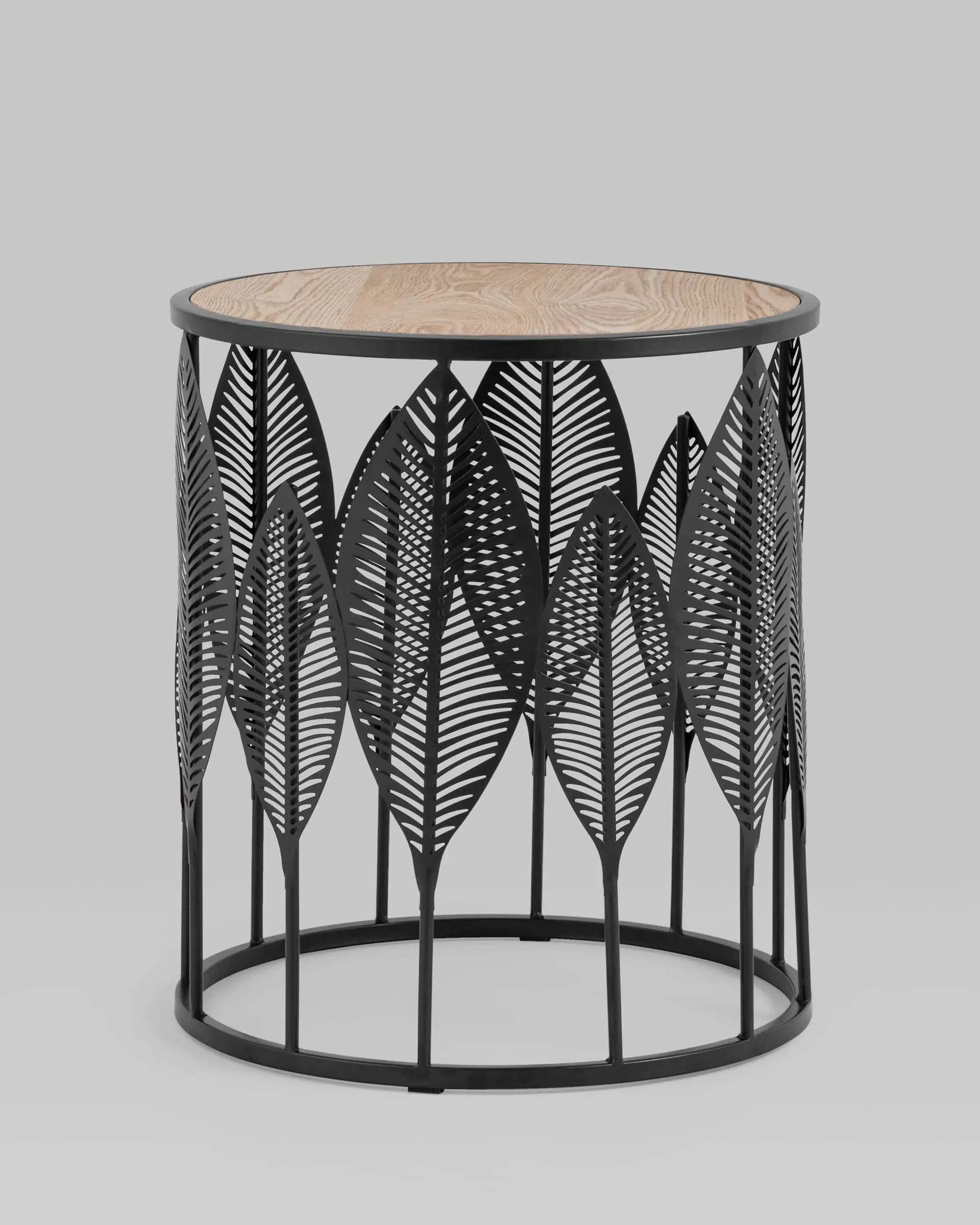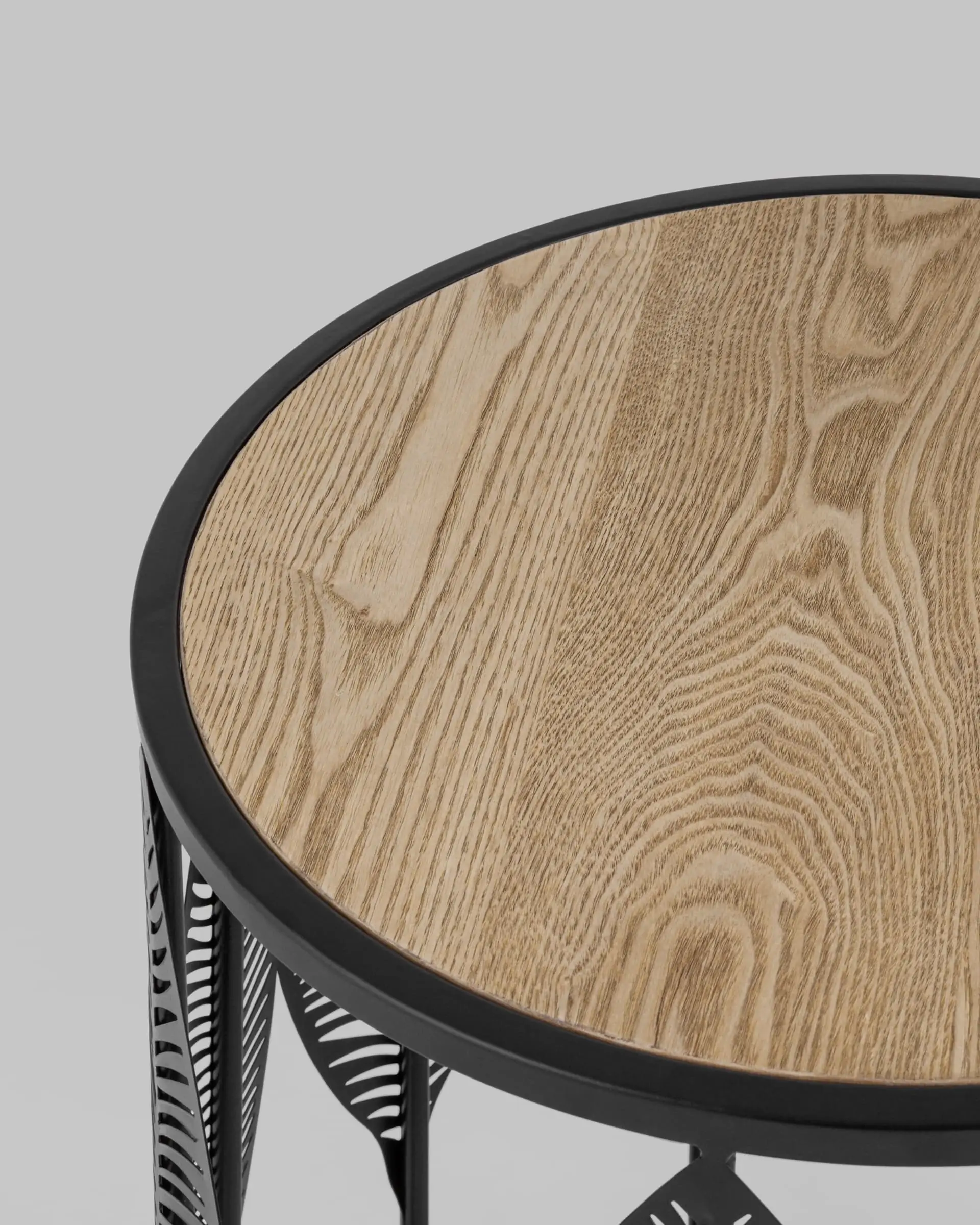 Круглый журнальный столик с черным каркасом. Столешница выполнена из МДФ и покрыта шпоном светлого дерева, гармонично сочетается с природными мотивами основания столика. Металлический каркас черного цвета выдерживает нагрузку до 50 кг. Журнальный столик поможет дополнить интерьер в эко-стиле и добавить уюта.